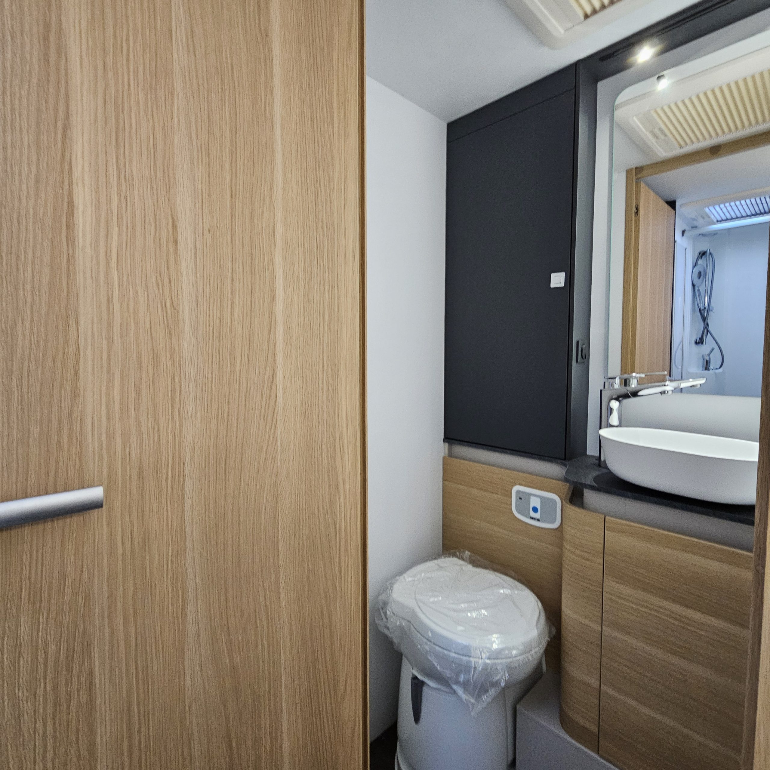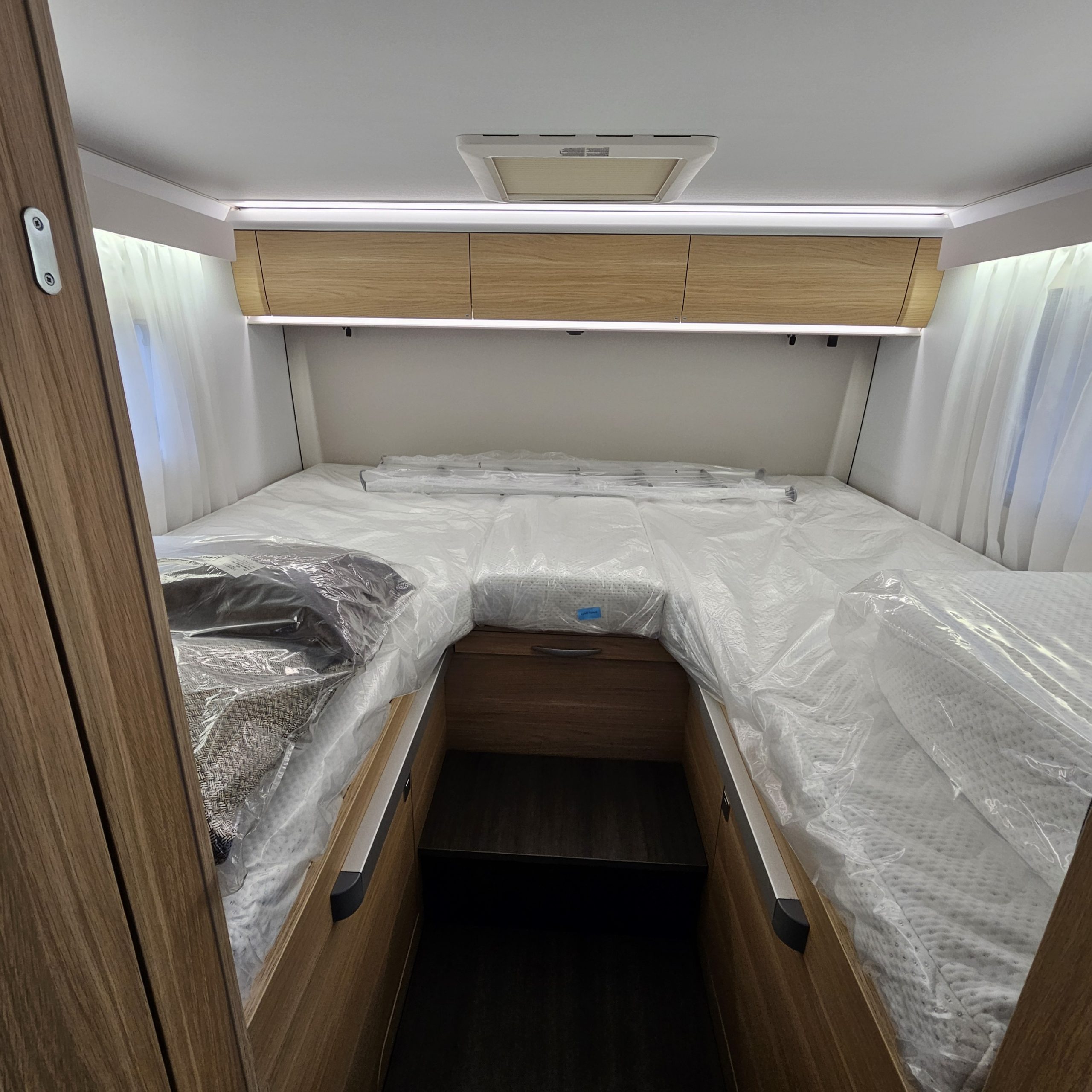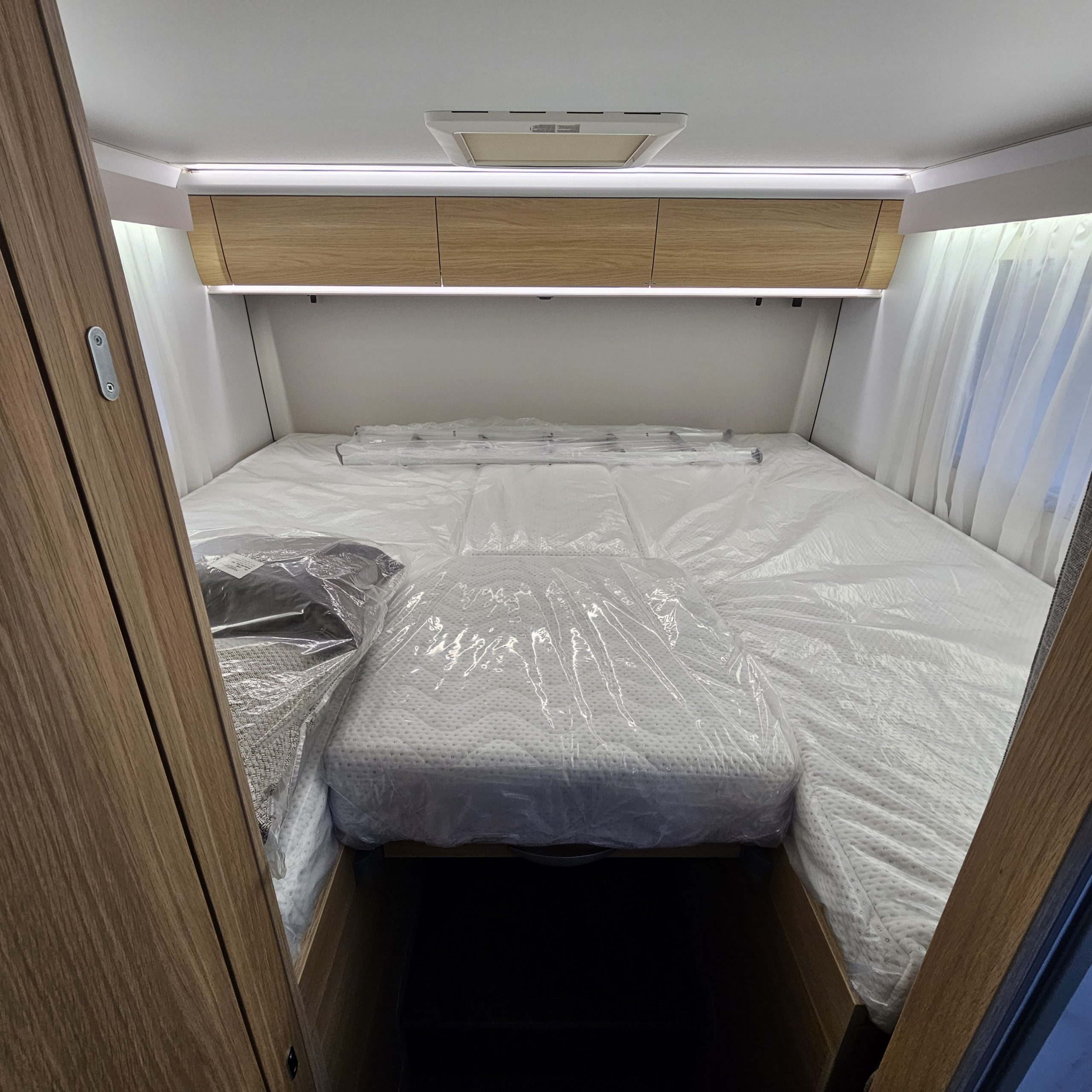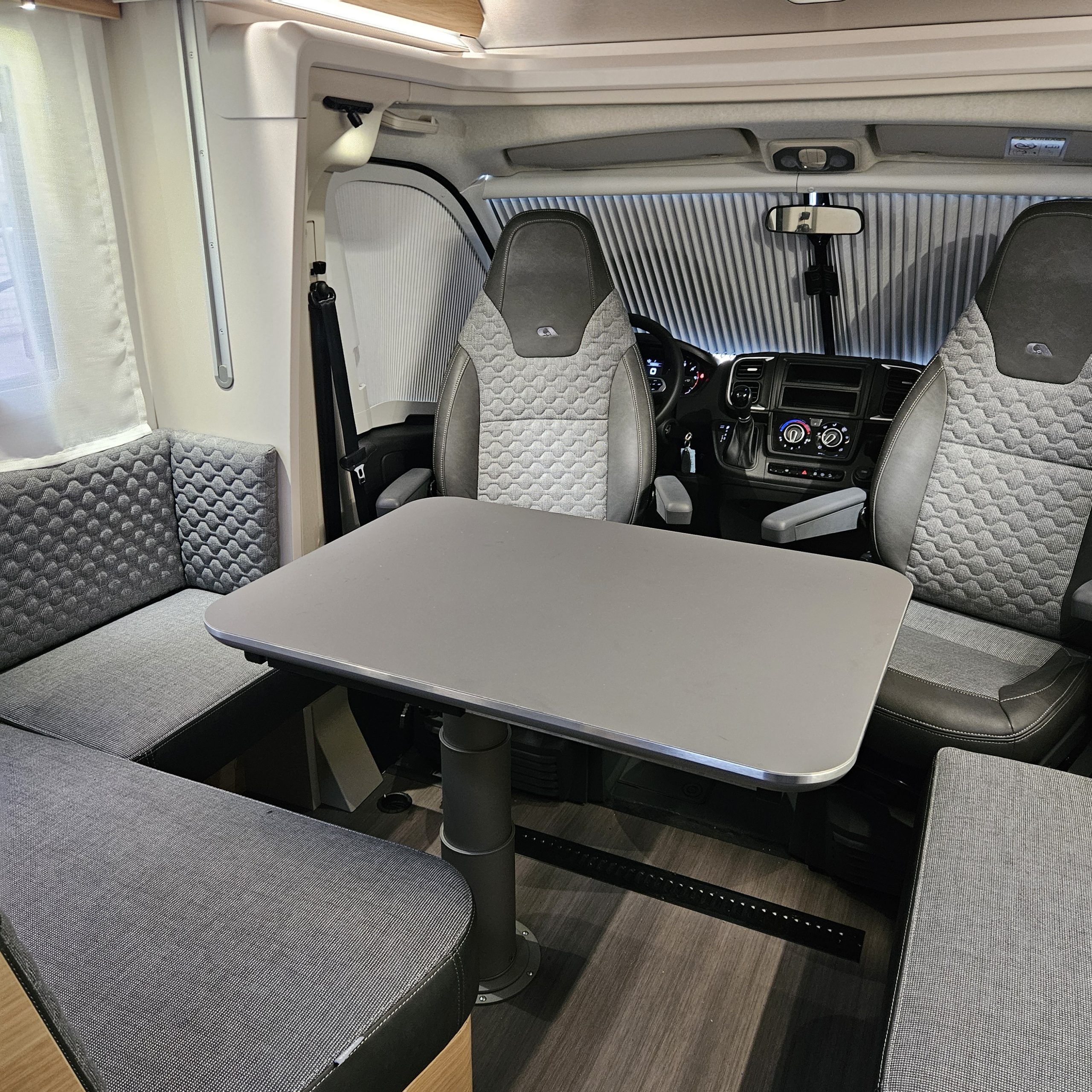 рамные окна в салоне, функциональный двоной пол, AGM-аккумулятор в салоне 100Ah, зарядное устройство 230V / 12V в гаражном отсеке, безопасный газовый редуктор MonoControl CS, кухонная вытяжка, плита и раковина с крышками, кассетный туалет с электросмывом, кровать-лифт в гостиной