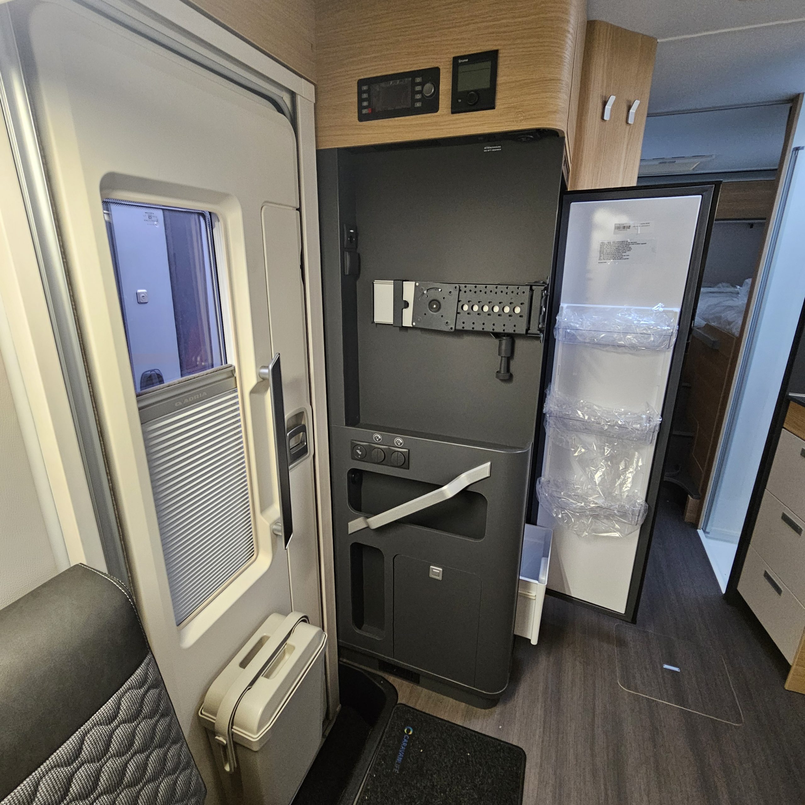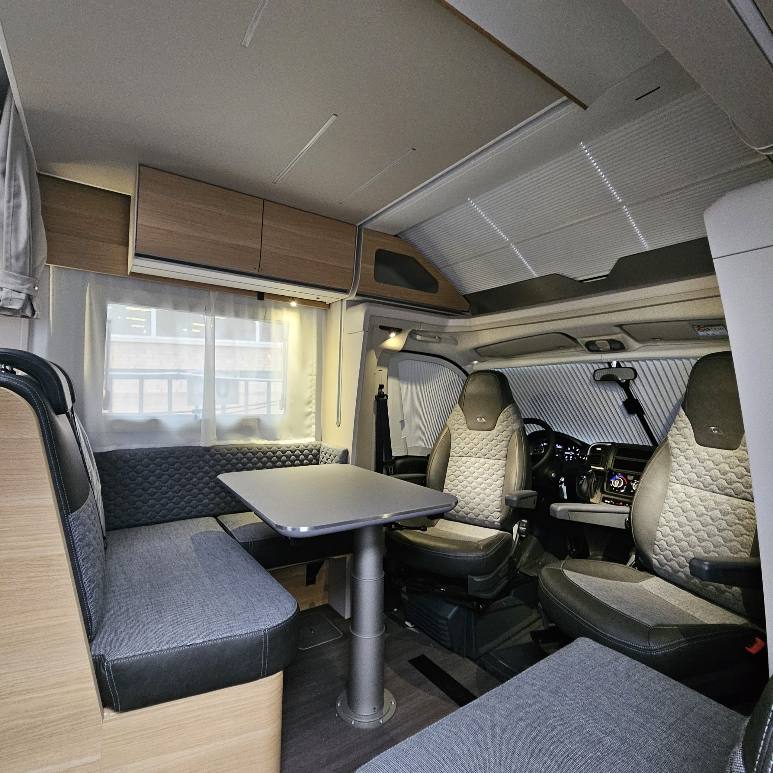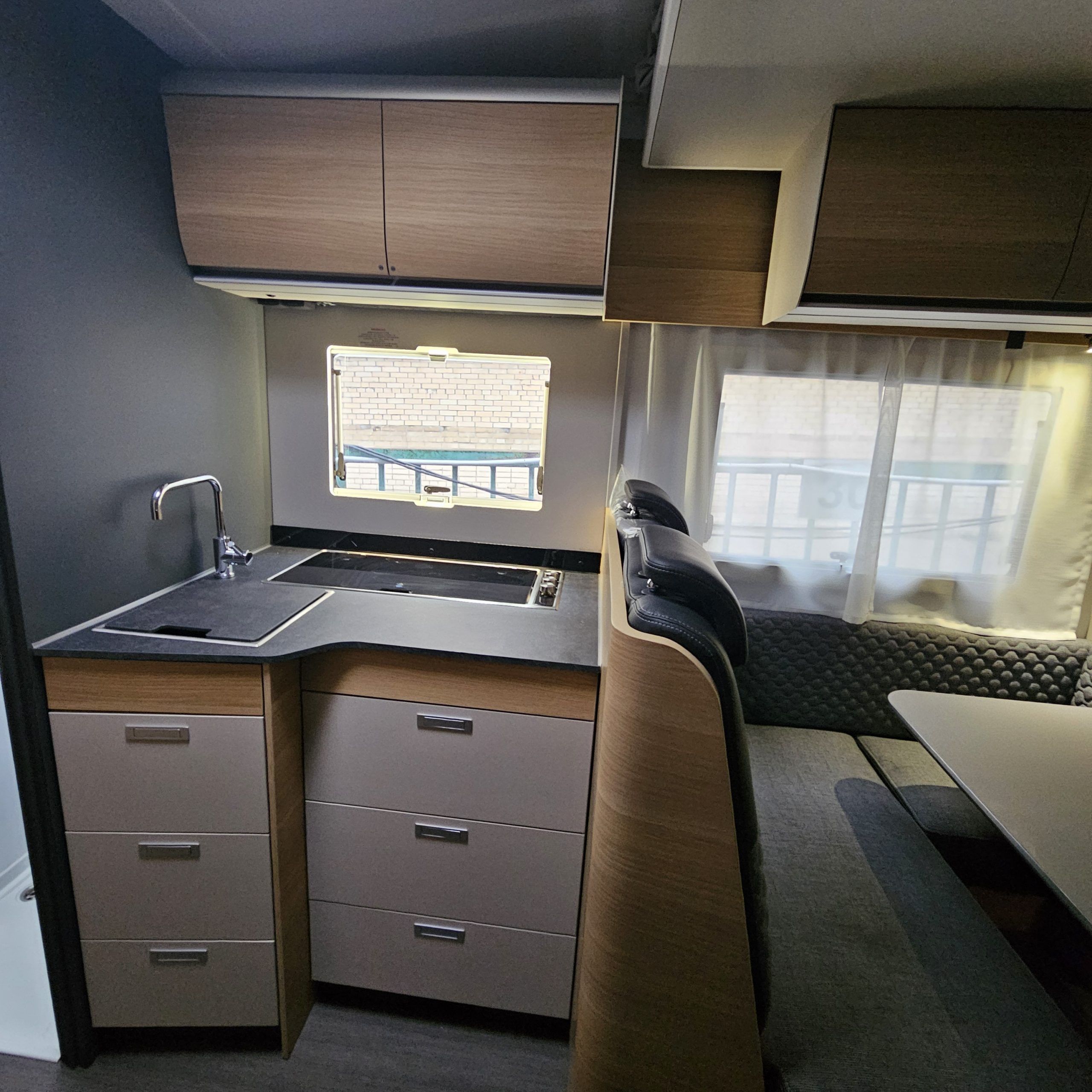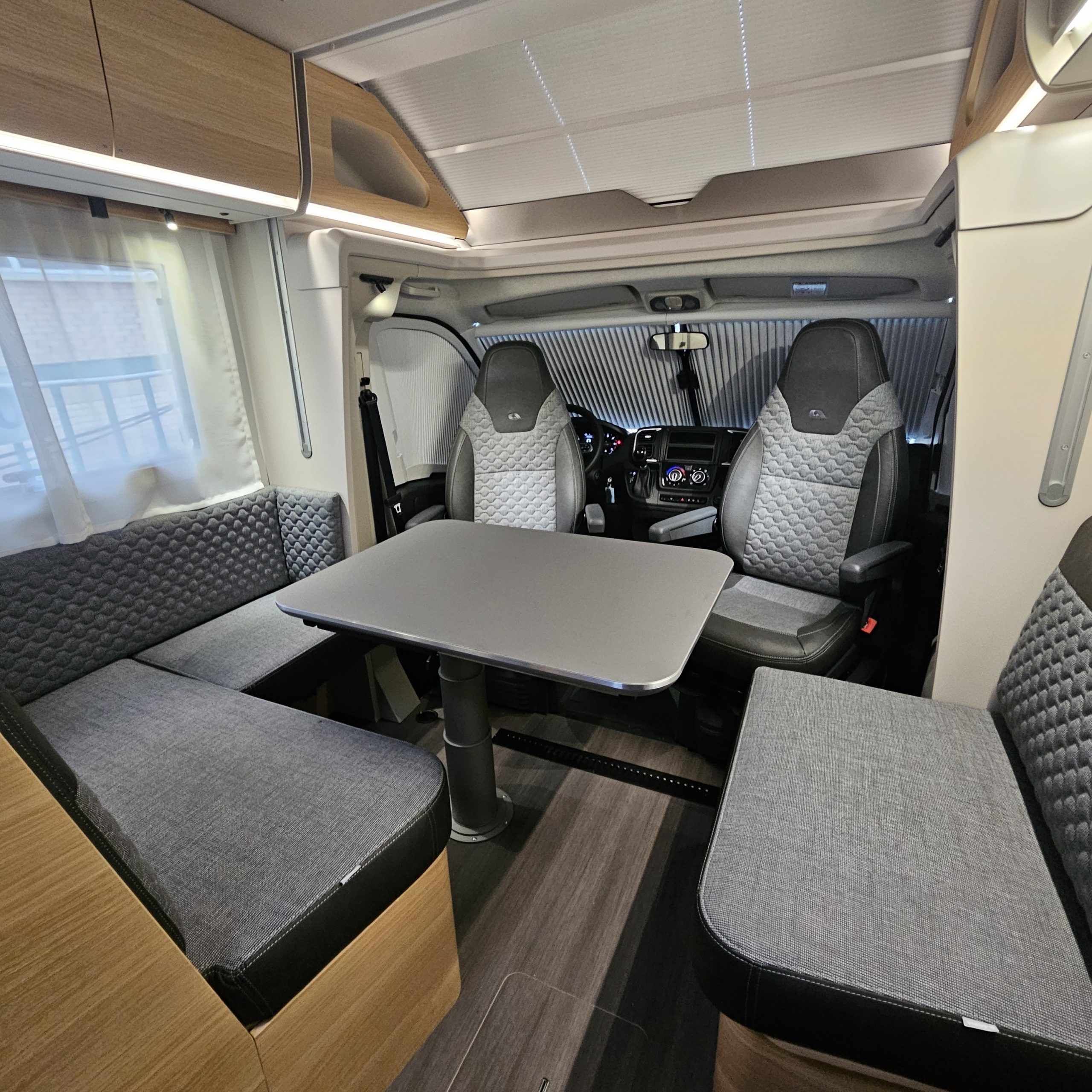 рамные окна в салоне, функциональный двоной пол, AGM-аккумулятор в салоне 100Ah, зарядное устройство 230V / 12V в гаражном отсеке, безопасный газовый редуктор MonoControl CS, кухонная вытяжка, плита и раковина с крышками, кассетный туалет с электросмывом, кровать-лифт в гостиной