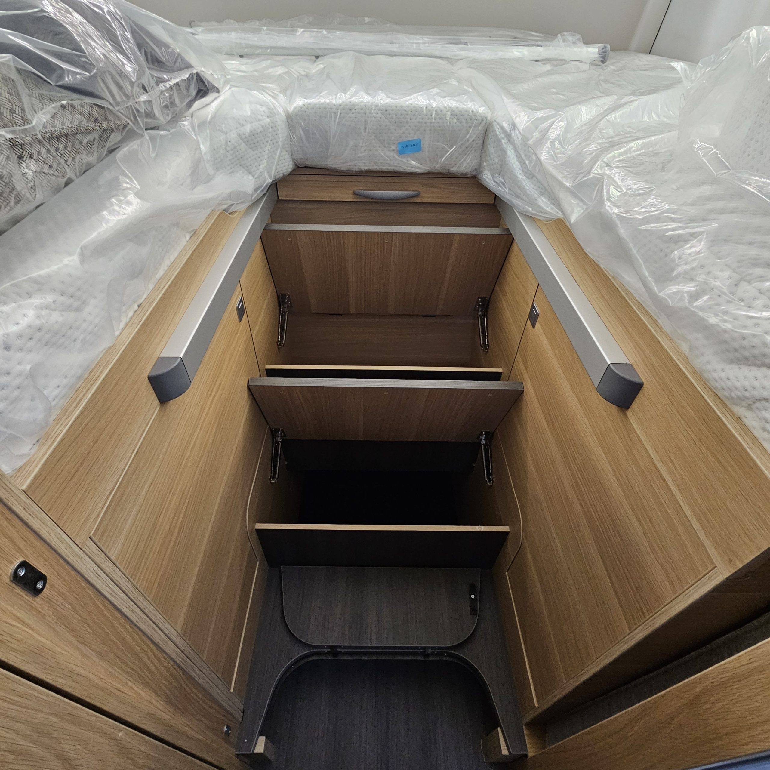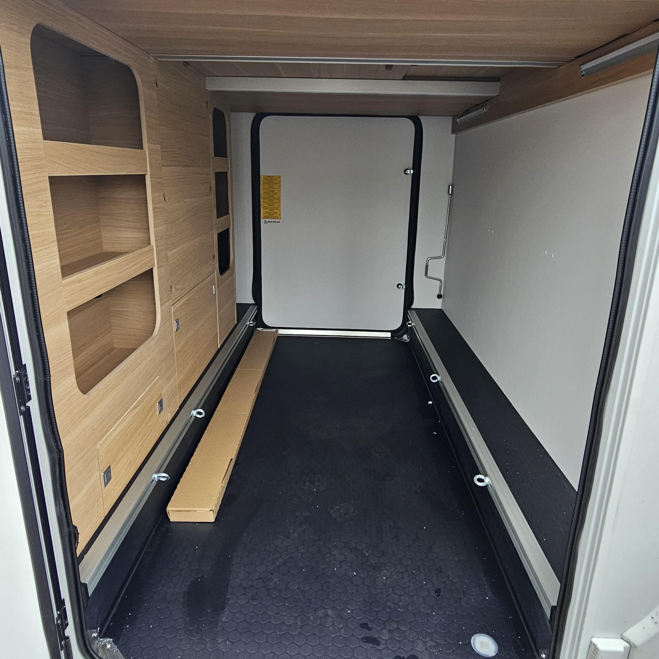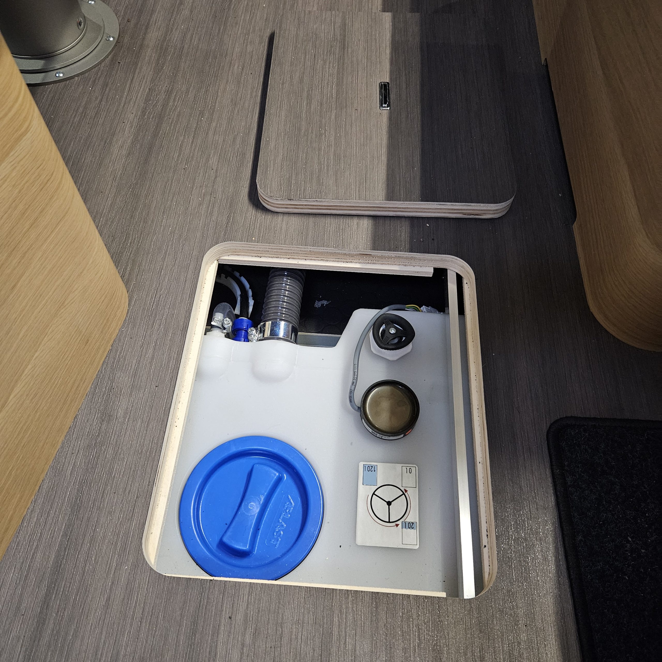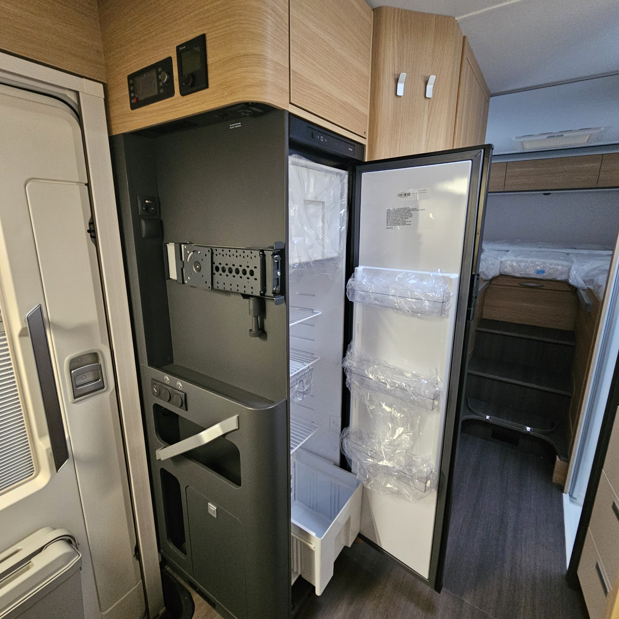 рамные окна в салоне, функциональный двоной пол, AGM-аккумулятор в салоне 100Ah, зарядное устройство 230V / 12V в гаражном отсеке, безопасный газовый редуктор MonoControl CS, кухонная вытяжка, плита и раковина с крышками, кассетный туалет с электросмывом, кровать-лифт в гостиной