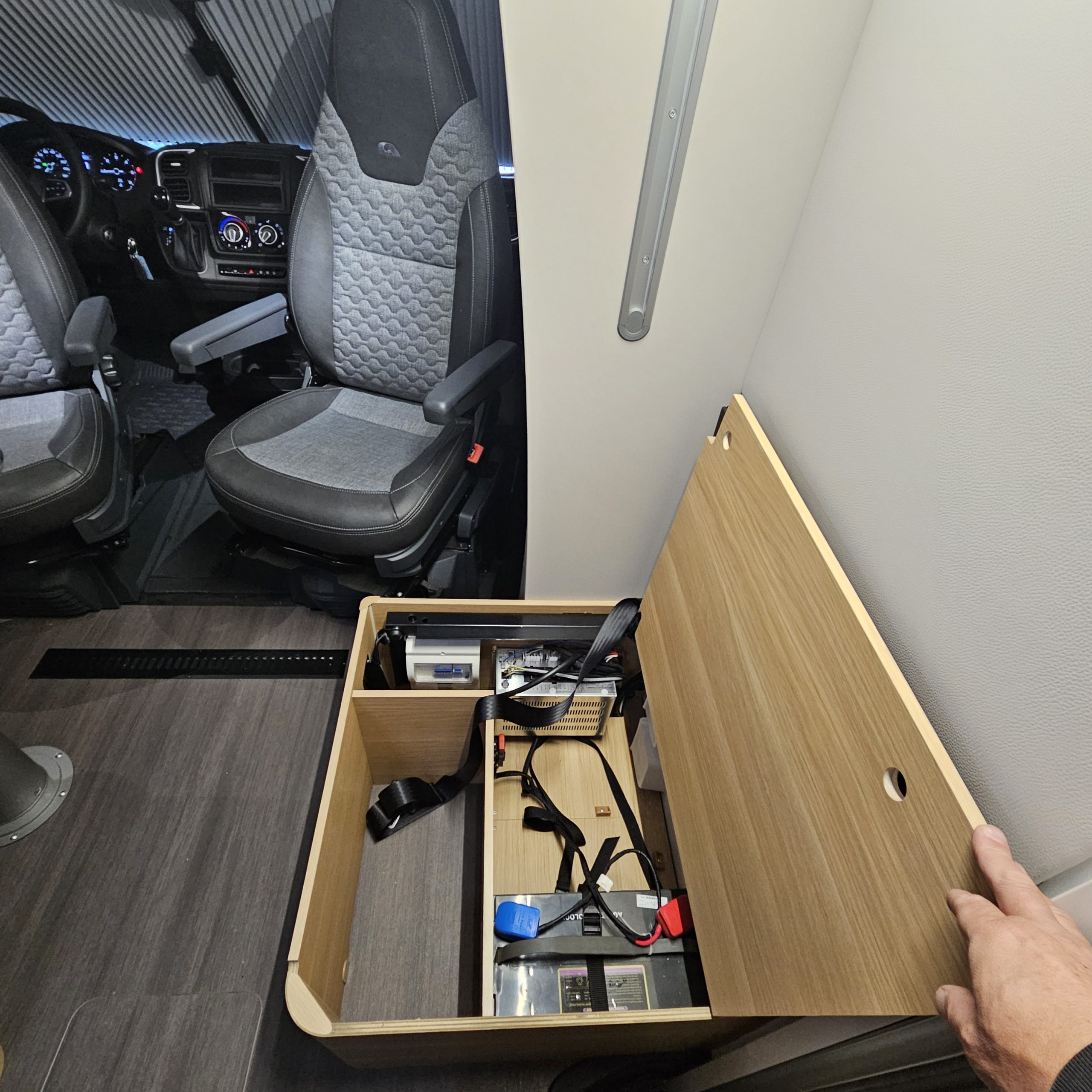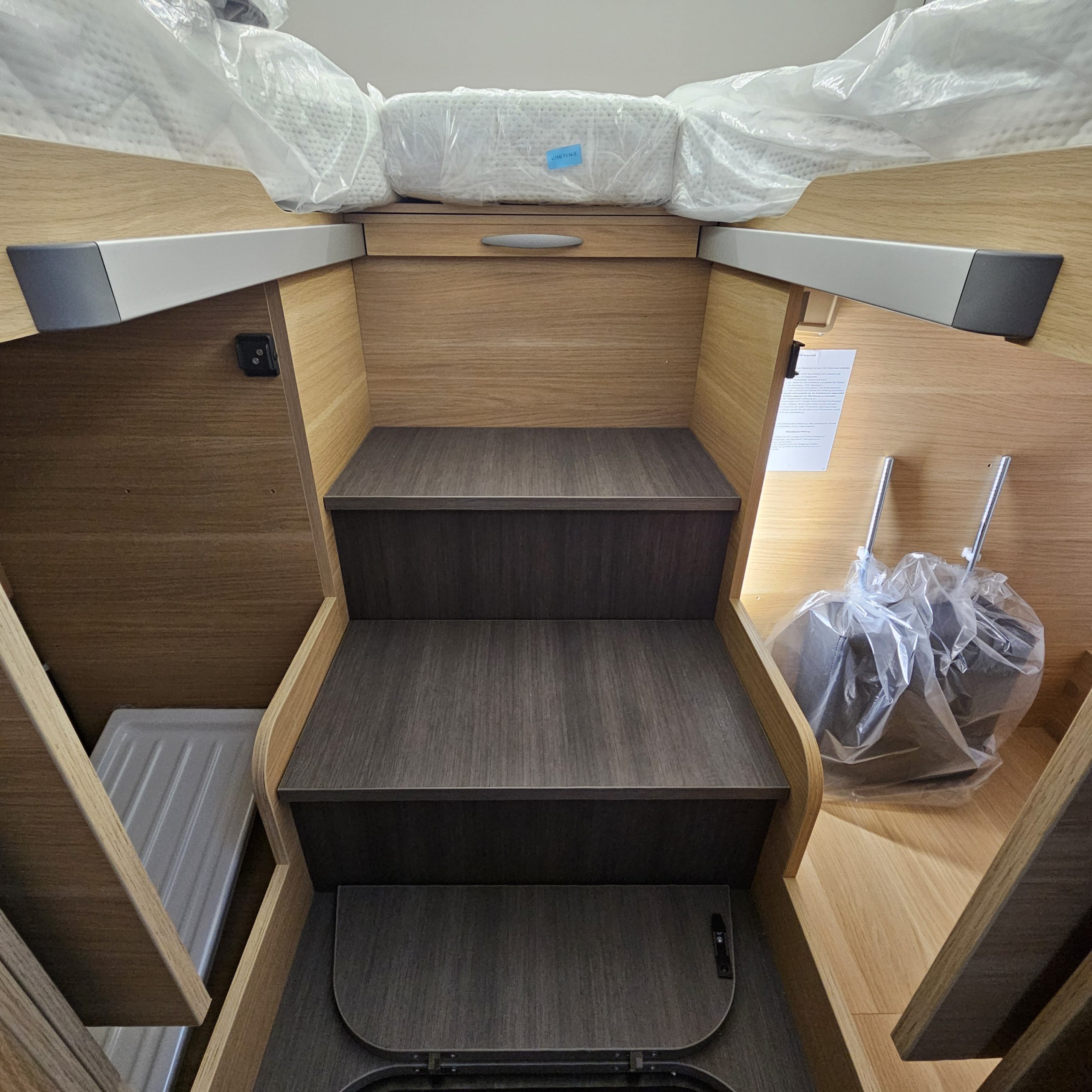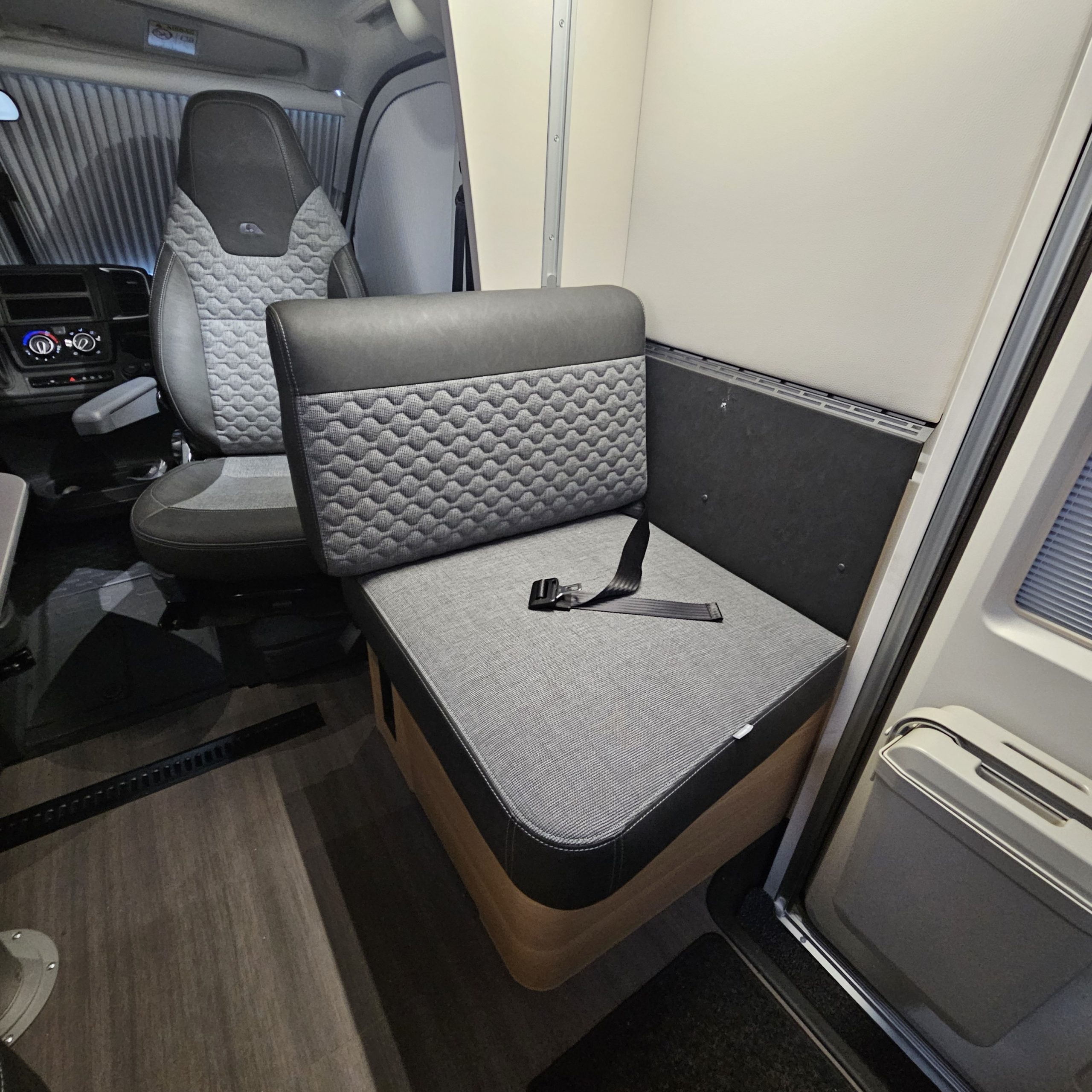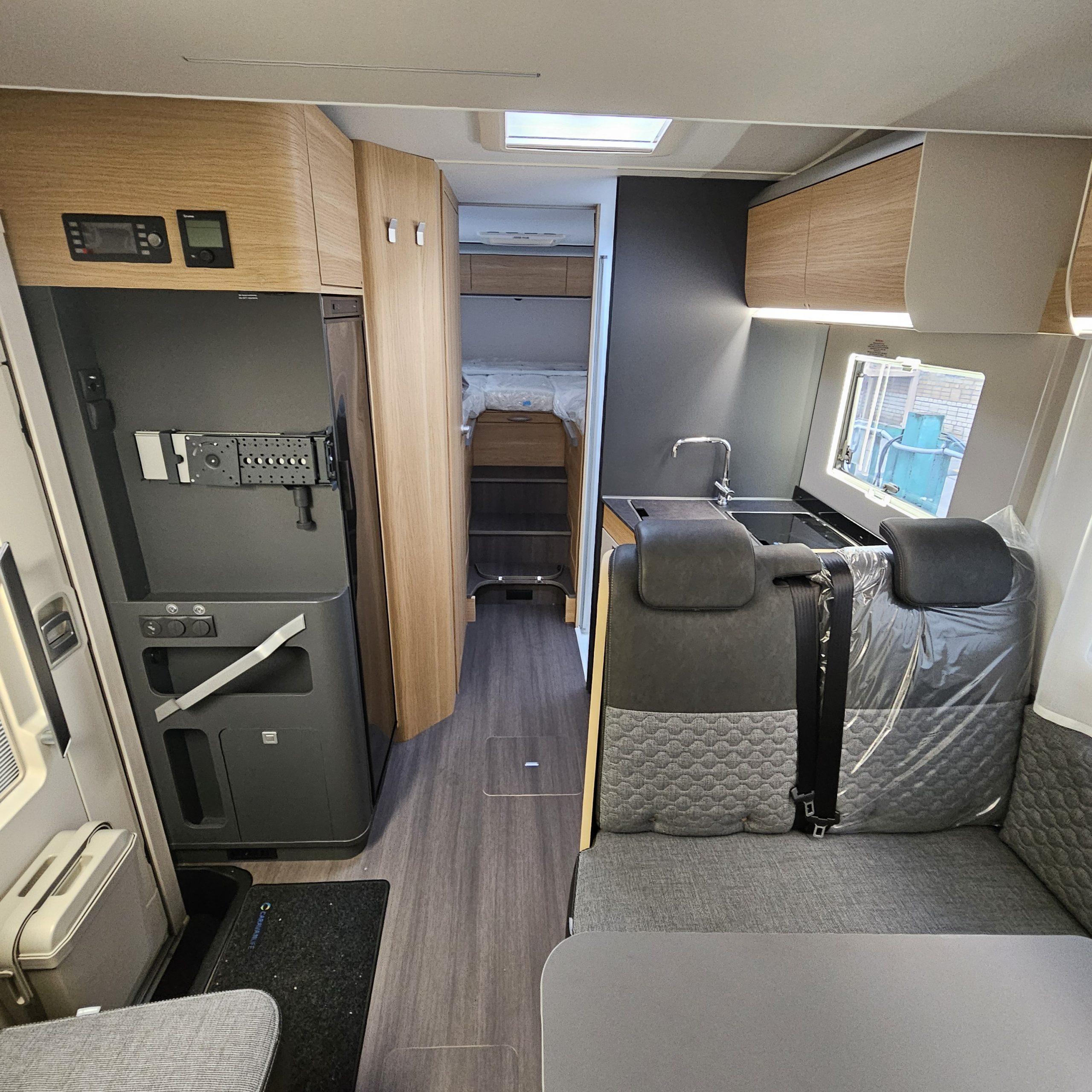 рамные окна в салоне, функциональный двоной пол, AGM-аккумулятор в салоне 100Ah, зарядное устройство 230V / 12V в гаражном отсеке, безопасный газовый редуктор MonoControl CS, кухонная вытяжка, плита и раковина с крышками, кассетный туалет с электросмывом, кровать-лифт в гостиной