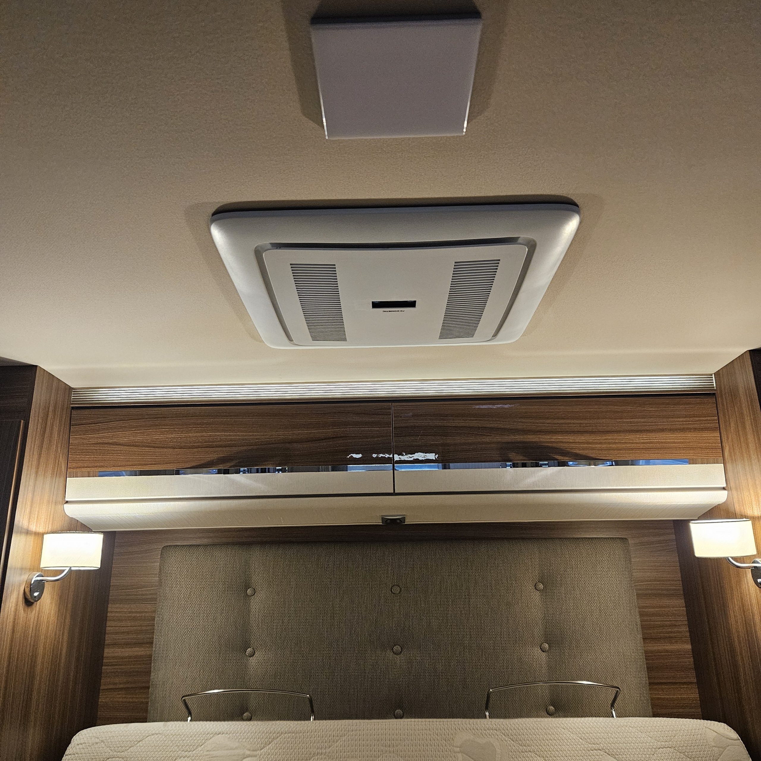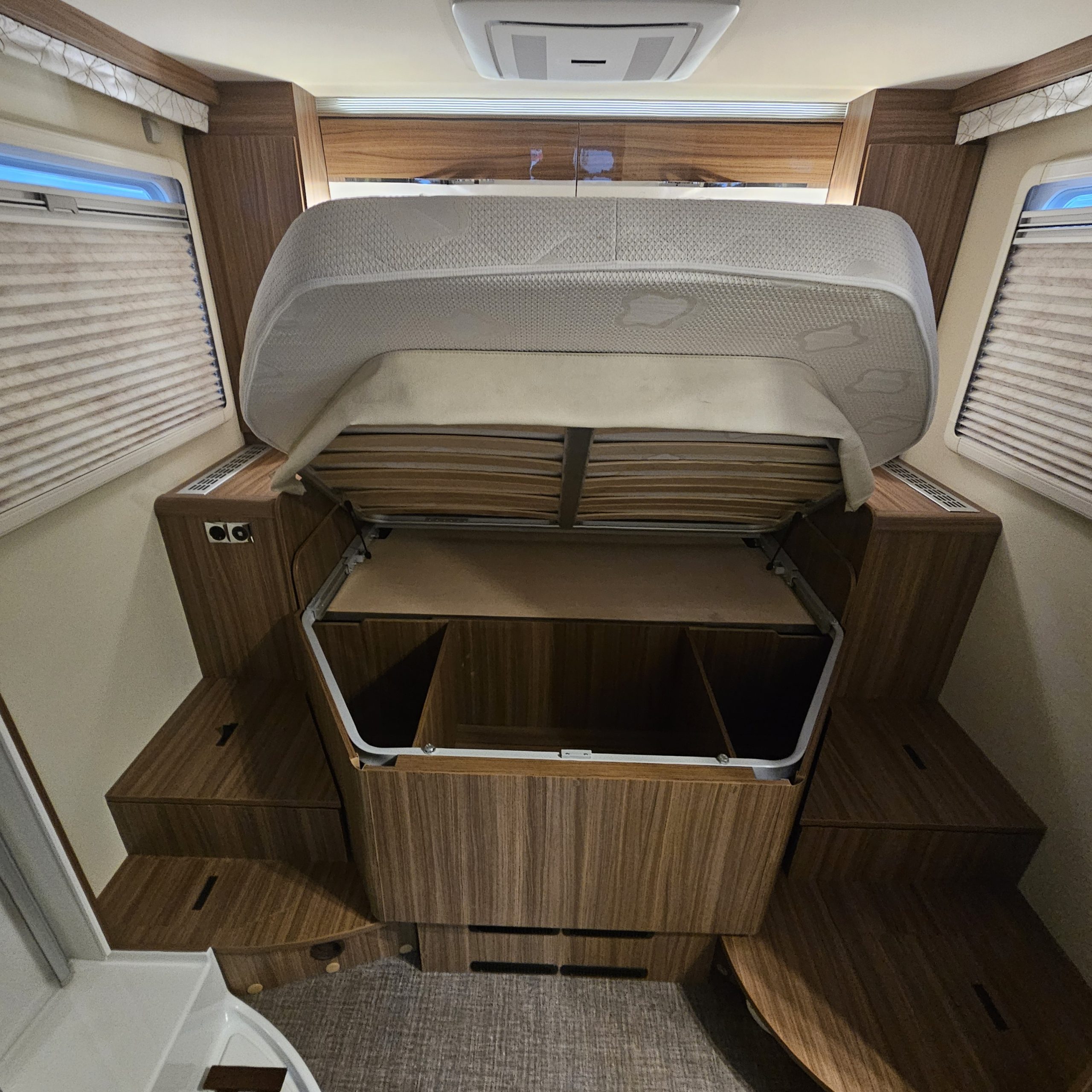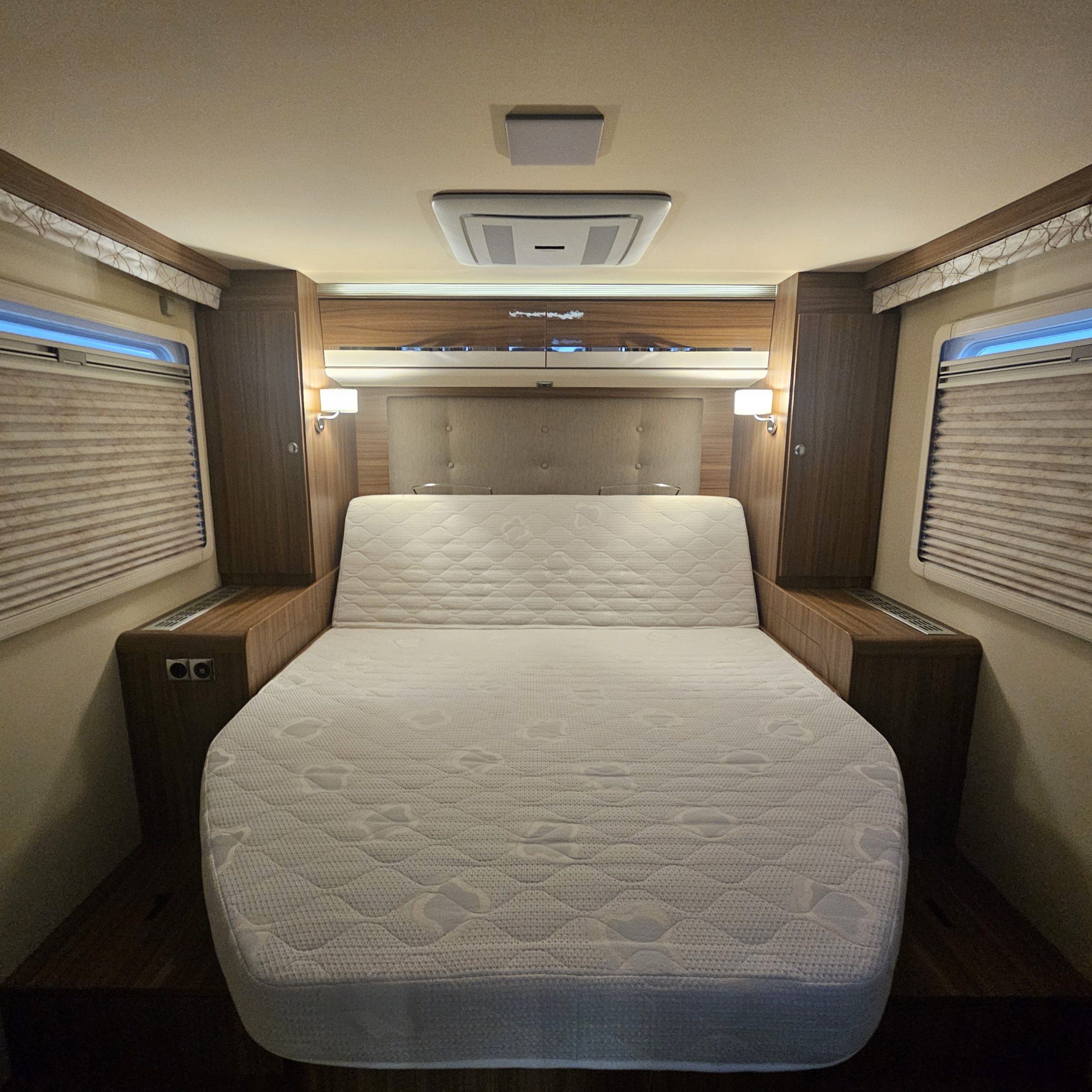 - двуспальная кровать сзади, размер 190*150 см, регулируется по высоте, тем самым предлагая возможность выбрать комфортную высоту кровати внутри автодома и оптимизировать объём багажного отсека! Имеет положение "для чтения", с подъёмом изголовья