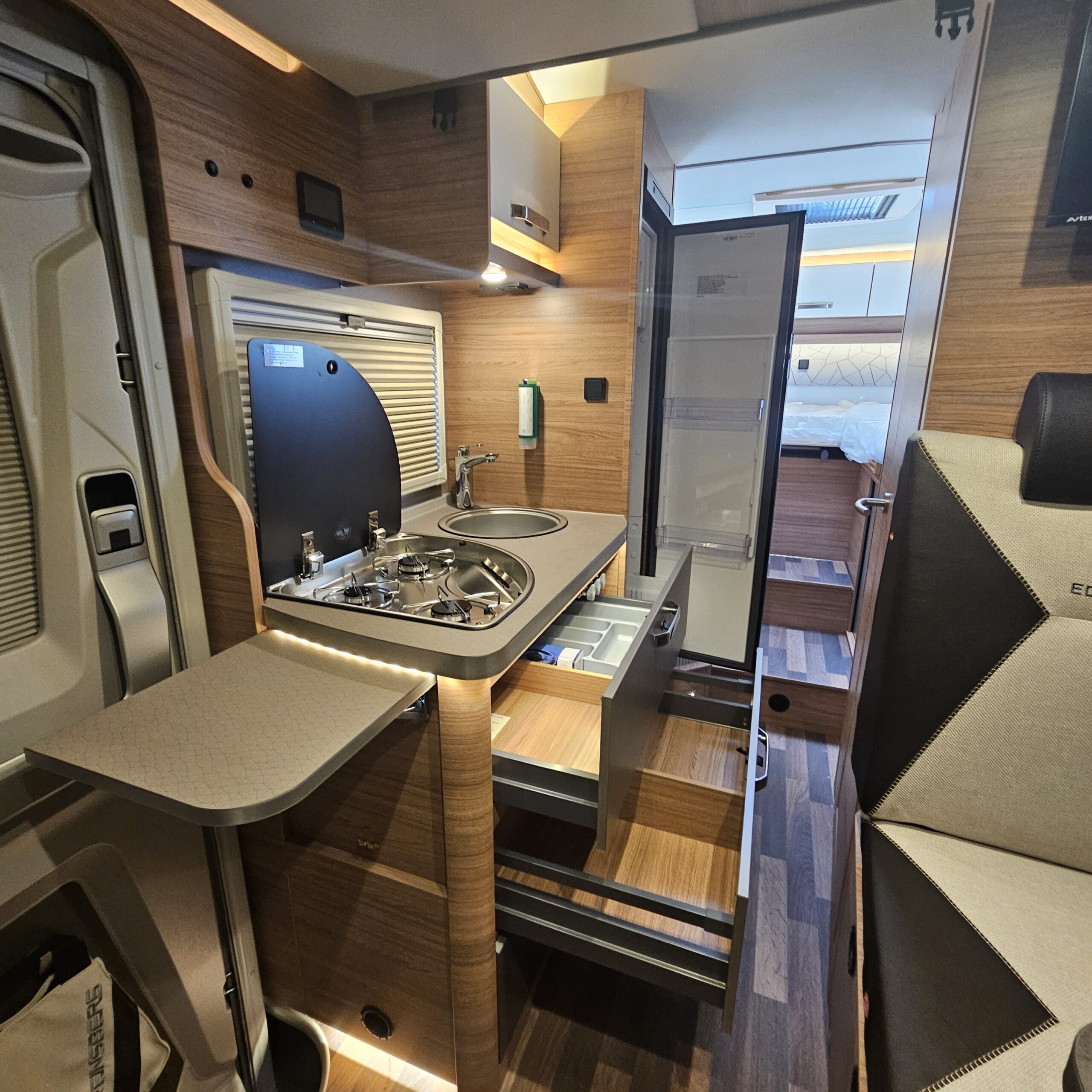 ✅Кухонный блок с откидной вспомогательной столешницей, раковина, газовая трёхкомфорочная плита с поджигом, холодильник с автоматическим выбором энергии (газ/220/12) 142 л Thetford